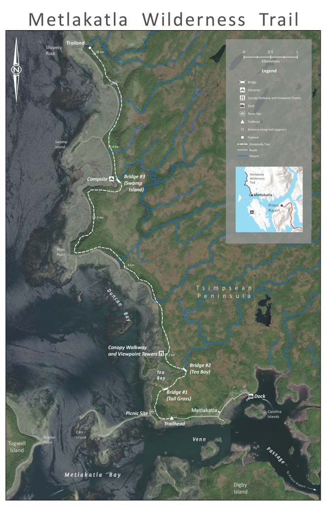 The trail starts on a 5.5 km gravel path, followed by a 3 km cedar boardwalk. The last 4.5 km has the marked trail passing through mossy forest floors and coastal areas.